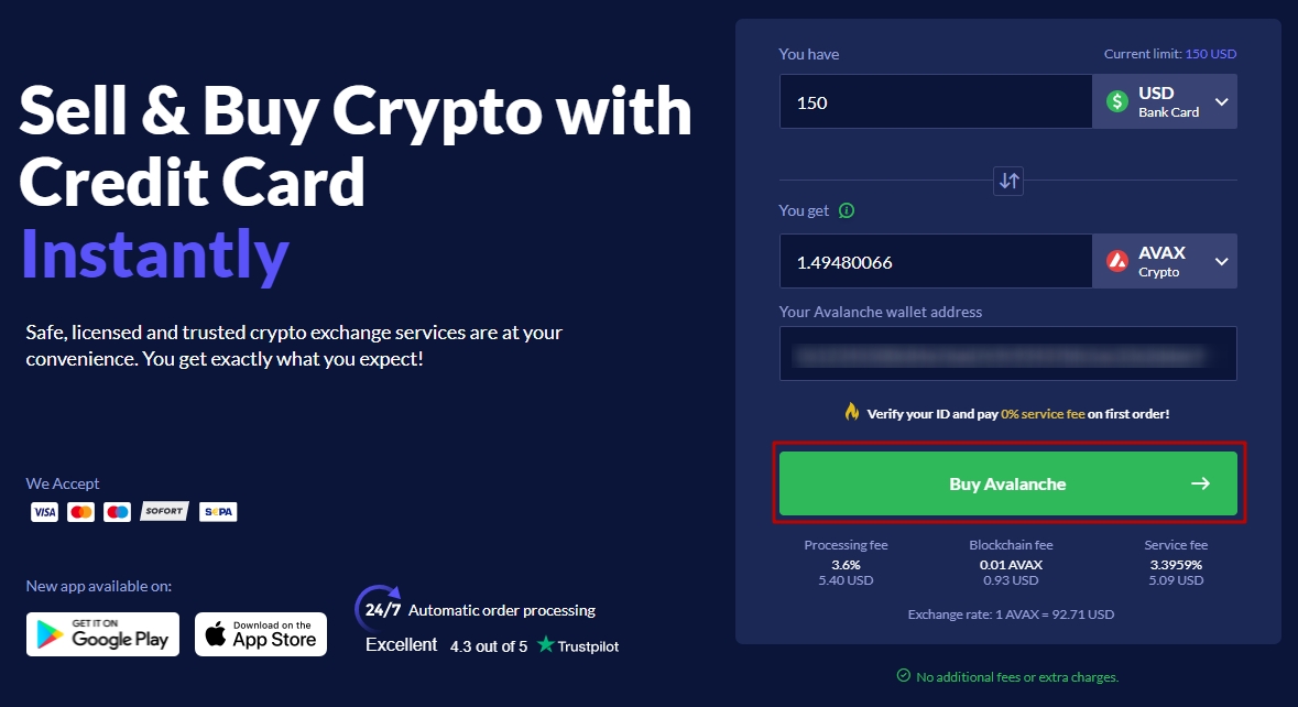If you’re wondering where to buy Avalanche tokens, you should definitely think about buying them at Switchere. On our platform, you have an opportunity to buy AVAX in the fastest and most convenient ways. Moreover, we offer some surprising bonuses! Users of our platform enjoy a 0% service fee for the first order.