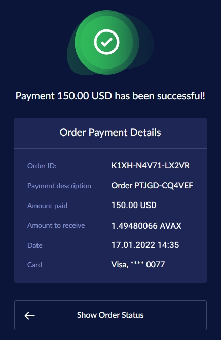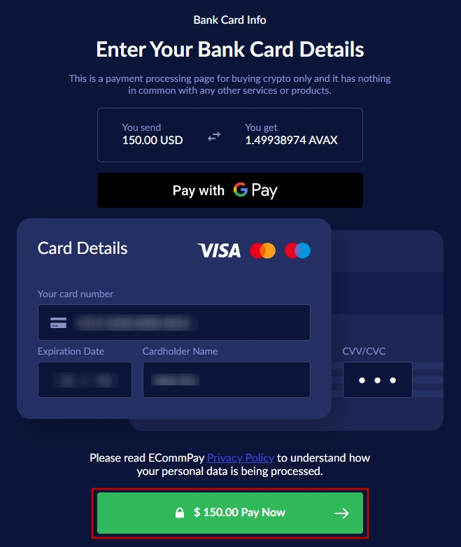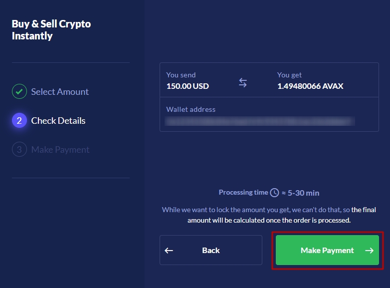 - Once you send the funds and your transaction receives the required number of blockchain confirmations, the amount of purchased AVAX will be sent to your provided wallet address accordingly.